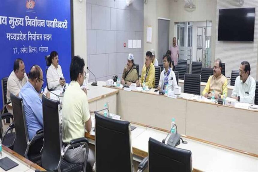 भारत निर्वाचन आयोग के निर्देश पर राज्य में शीघ्र ही होने वाले निर्वाचक नामावली के गहन/संक्षिप्त पुनरीक्षण की तैयारी के संबंध में आज भोपाल में मुख्य निर्वाचन पदाधिकारी ने मान्यता प्राप्त राजनीतिक दलों के पदाधिकारियों के साथ बैठक की।