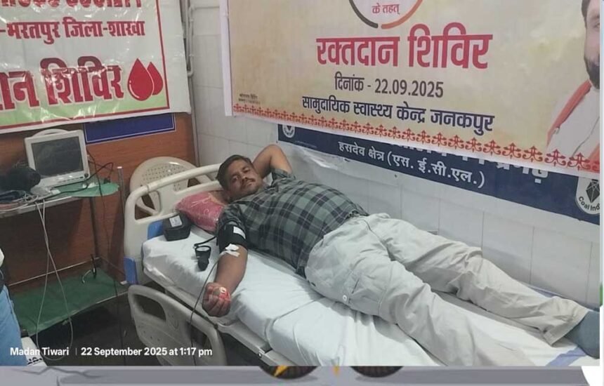 प्रधानमंत्री नरेंद्र मोदी के जन्मदिवस के अवसर पर भारतीय जनता पार्टी द्वारा पूरे देश में सेवा पखवाड़ा की शुरुआत की गई है। इसी क्रम में भाजपा मंडल जनकपुर द्वारा आज दिनांक 22 सितंबर 2025 को जनकपुर के सामुदायिक स्वास्थ्य केंद्र में रक्तदान शिविर का आयोजन किया गया। इस शिविर में बड़ी संख्या में भाजपा कार्यकर्ता शामिल हुए, वहीं क्षेत्र के युवाओं ने भी बढ़-चढक़र हिस्सा लिया। जहां कार्यकर्ताओं द्वारा कुल 9 यूनिट रक्तदान किया गया। जिसमें जनकपुर मंडल के मंडल अध्यक्ष नरेश यादव, जिला मंत्री पवन शुक्ला, नगर पंचायत के उपाध्यक्ष निलेश मिश्रा, रामनरेश यादव , गणेश तिवारी,अमित गुप्ता,ओम प्रकाश सोनी, अंकुश सिंह, रमेश बैगा ने रक्तदान किया।