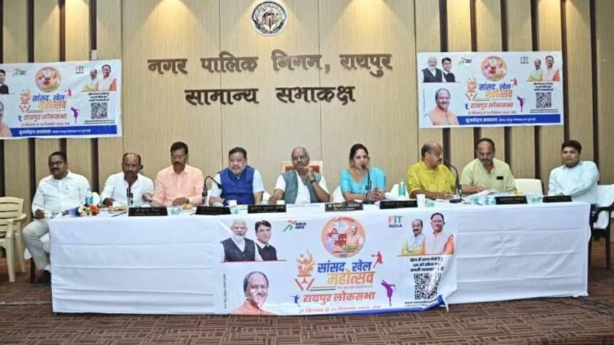 नगर निगम क्षेत्र में 15 से 19 नवंबर 2025 तक रायपुर लोकसभा सांसद खेल महोत्सव का आयोजन भारत गणराज्य के प्रधानमंत्री नरेन्द्र मोदी के आव्हान पर केन्द्र सरकार के खेल मंत्रालय के फिट इंडिया मुव्हमेंट को जनआंदोलन बनाने किया जाएगा. लोकसभा सांसद बृजमोहन अग्रवाल ने रायपुर नगर निगम मुख्यालय के सामान्य सभा सभागार में पहुंचकर रायपुर दक्षिण विधायक सुनील सोनी, रायपुर उत्तर विधायक पुरंदर मिश्रा, रायपुर ग्रामीण विधायक मोतीलाल साहू, नगर निगम रायपुर की महापौर मीनल चौबे की उपस्थिति में बैठक लेकर रायपुर लोकसभा सांसद खेल महोत्सव के आयोजन की रूप रेखा की विस्तृत जानकारी देकर कहा कि रायपुर लोकसभा सांसद खेल महोत्सव के माध्यम से रायपुर नगर निगम के सभी 10 जोनो के सभी 70 वार्डो में नागरिको के बीच खेल का वातावरण बनें.