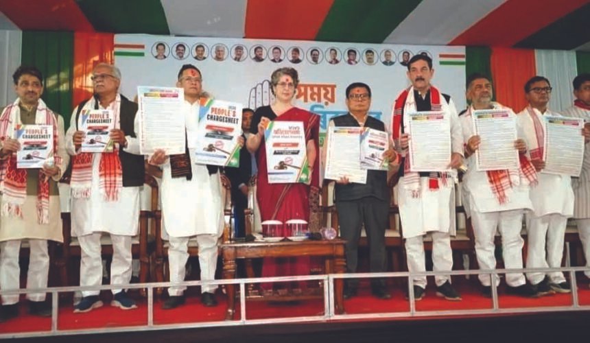 विपक्षी पार्टी ने विधानसभा चुनावों से पहले यह 'आरोपपत्र' जारी किया। कांग्रेस ने आरोप लगाया कि एक दशक के शासनकाल के बावजूद भाजपा सरकार छह आदिवासी समुदायों को अनुसूचित जनजाति का दर्जा दिलवाने और चाय बागान श्रमिकों की दैनिक मजदूरी बढ़ाकर 351 रुपये करने के अपने वादे को पूरे करने में विफल रही।